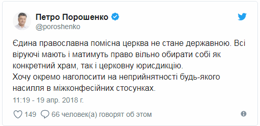 Кроме того, Порошенко отметил, что объединенная поместная православная церковь, которую на Украине вознамерились создать, государственной никогда не будет, поскольку насилие в любых отношениях, связанных с верой абсолютно неприемлемо и недопустимо.