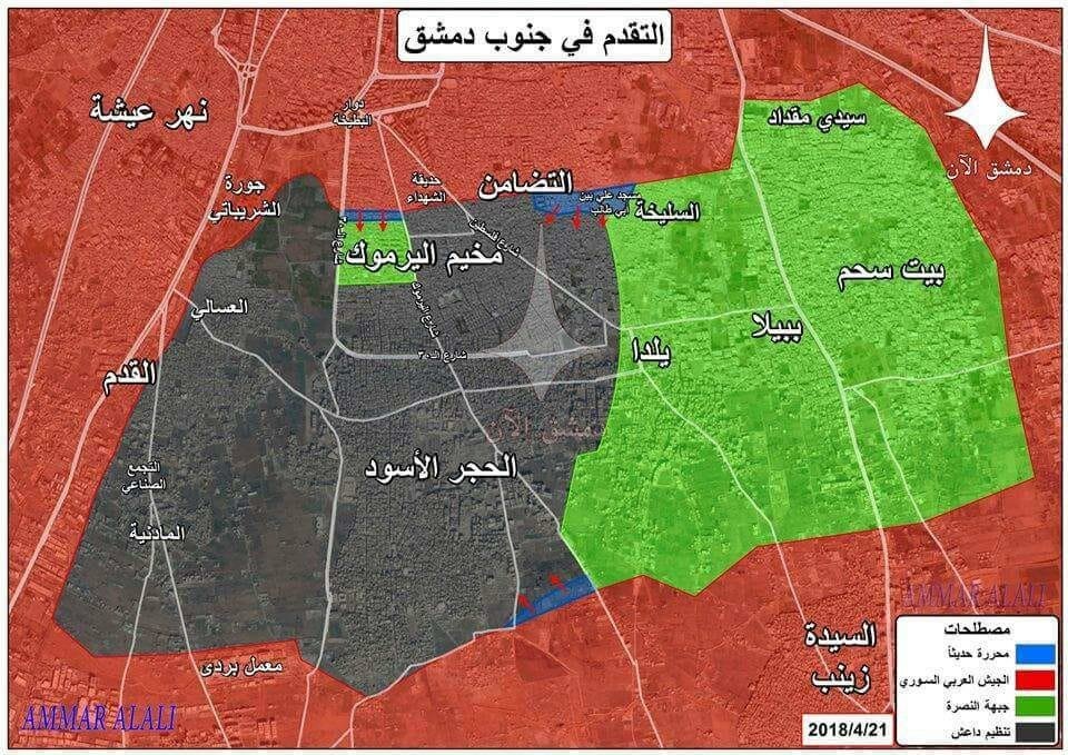 Телеграм-канал "Вестник Дамаска" публикует карту районов, занятых террористами на юге Дамаска.