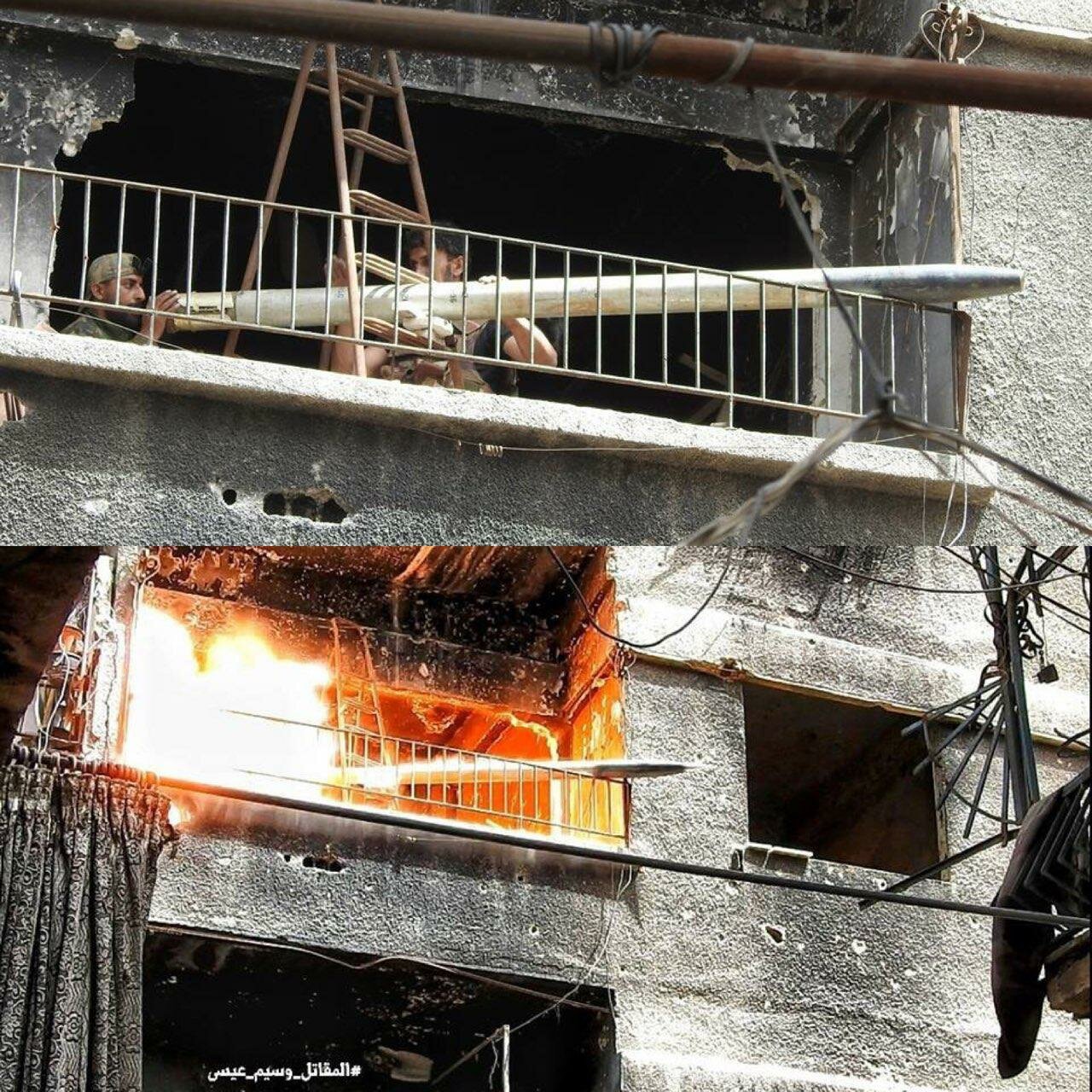 В настоящее время бои на юге Дамаска продолжаются. В Сети опубликованы кадры, как сирийские военные запускают ракету с балкона здания полуразрушенного здания.