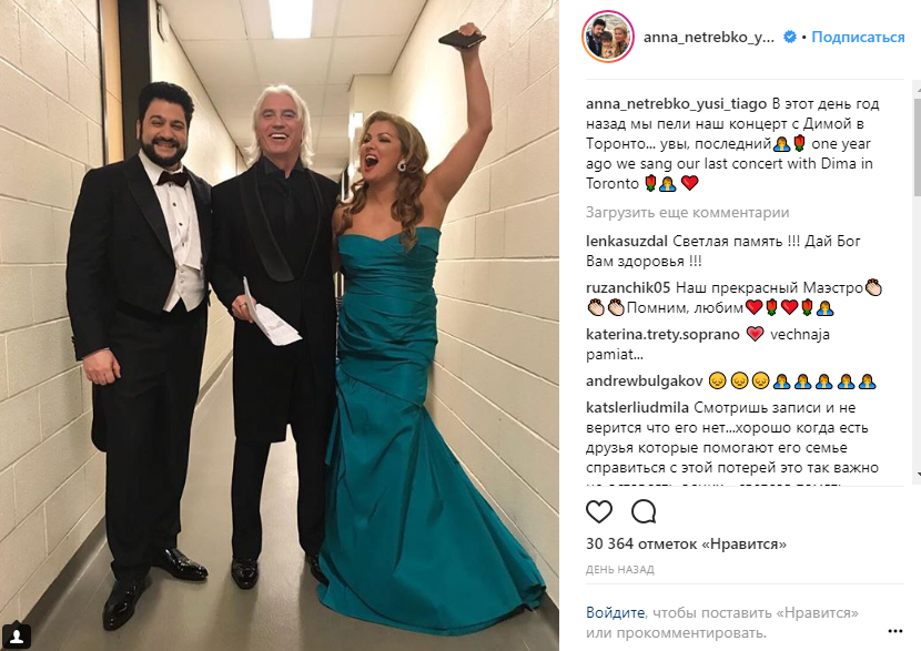 "В этот день год назад мы пели наш концерт с Димой в Торонто... увы, последний", - рассказала Нетребко.