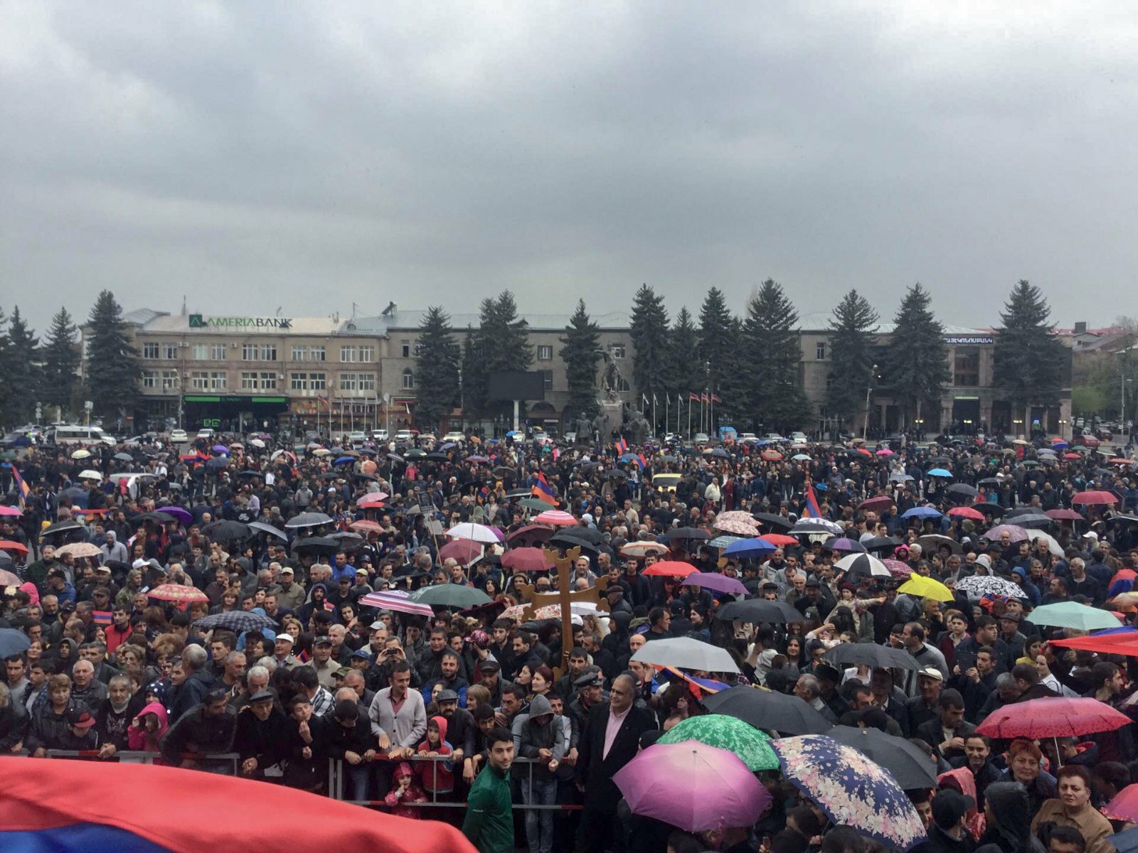 Митинг в Гюмри проходит под проливным дождем. Площадь Вардананц многолюдна. В акции принимают участие не только жители Гюмри, но и других областей, приехали митингующие из столицы.