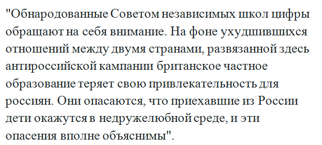 Кроме этого, в сообщении отмечается, что в школах Соединенного Королевства проводятся различного рода политизированные опросы, а также фиксируются антироссийские высказывания среди преподавательского состава. Это все негативно сказывается на условиях обучения российских учеников.
