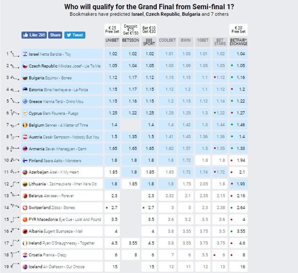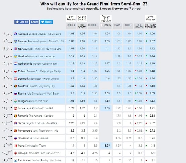 Букмекеры смогли спрогнозировать шансы на попадание некоторых стран в финал известного конкурса. В Интернет были выставлены таблицы с участниками двух полуфиналов. Вверху расположены артисты, шансы которых попасть в финал наиболее высоки.