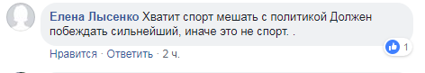 "Хватит спорт мешать с политикой. Должен побеждать сильнейший, иначе это не спорт", - подчеркнула Елена Лысенко.