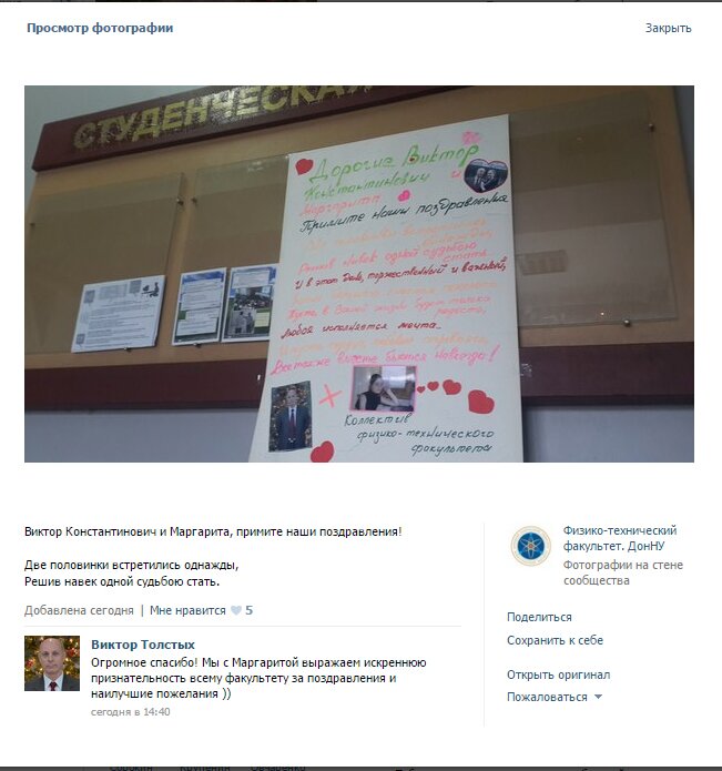 И если в социальных сетях фотографии преподавателя с обнаженной девушкой вызвали бурю критики, исходящей в основном от украинской аудитории, то коллеги Толстых и студенты донецкого вуза от души поздравили "молодоженов", разместив на стенде в университете поздравление влюбленным.