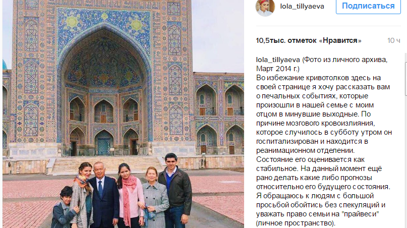 "По причине мозгового кровоизлияния он (Ислам Каримов) госпитализирован и находится в реанимационном отделении. Состояние его оценивается как стабильное", – написала она накануне.