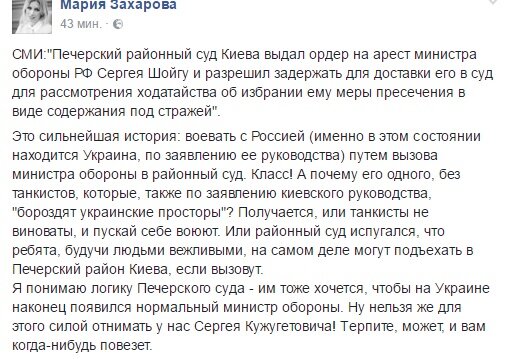 Пресс-секретарь российского внешнеполитического ведомства подчеркнула: "Это сильнейшая история: воевать с Россией (именно в этом состоянии находится Украина, по заявлению ее руководства) путем вызова министра обороны в районный суд", - сообщает "Российский Диалог".
