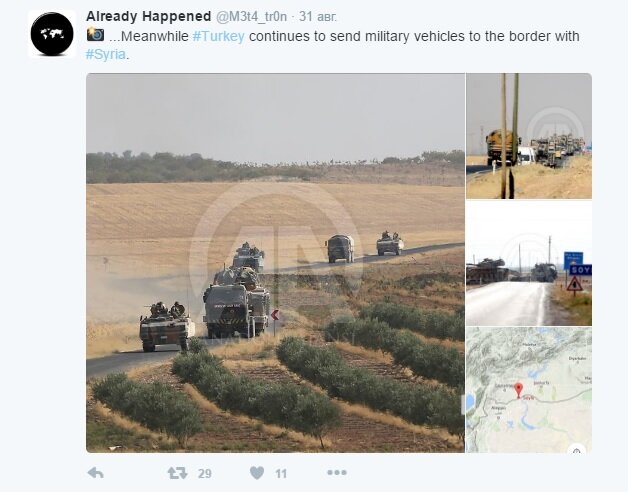 Колонна бронетехники была замечена на территории Турции еще в среду, 31 августа, а уже спустя два дня ее удалось заснять у самой сирийской границы, сообщает "Российский Диалог".