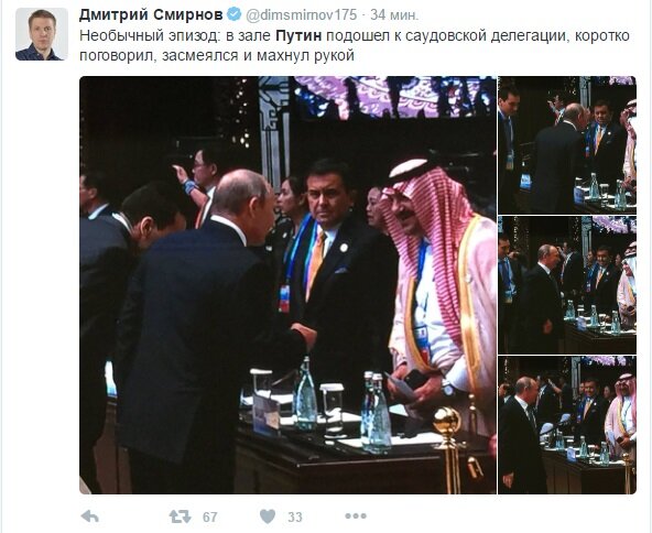 Журналист "Комсомольской правды" Дмитрий Смирнов рассказал о необычном инциденте с участием Путина и саудовской делегации, который произошел в зале, где изначально собрались все гости саммита, сообщает "Российский Диалог".