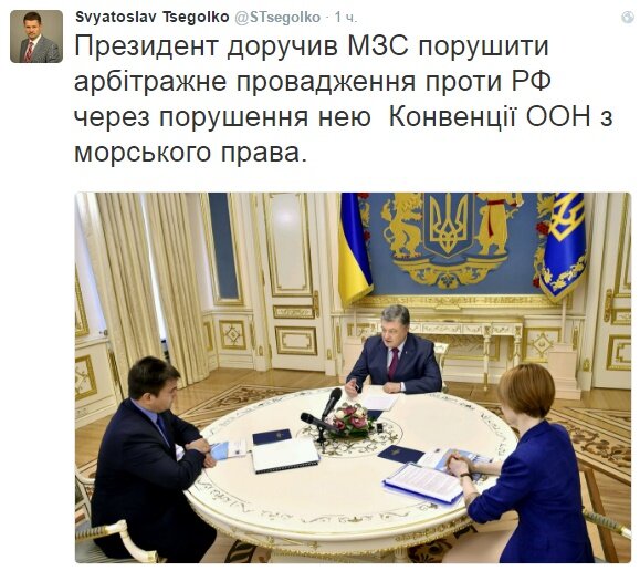 Порошенко добавил: "Поручаю министру иностранных дел Украины подписать и уже сегодня направить в Российскую Федерацию сообщение об арбитраже в соответствии с Конвенцией Организации Объединенных Наций по морскому праву".