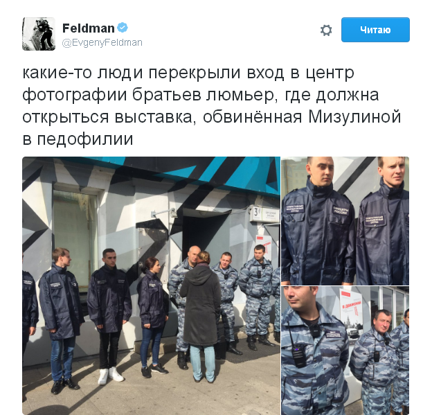 "Какие-то люди перекрыли вход в Центр фотографии братьев Люмьер, где должна открыться выставка, обвиненная Мизулиной в педофилии", - сообщают в социальных сетях.