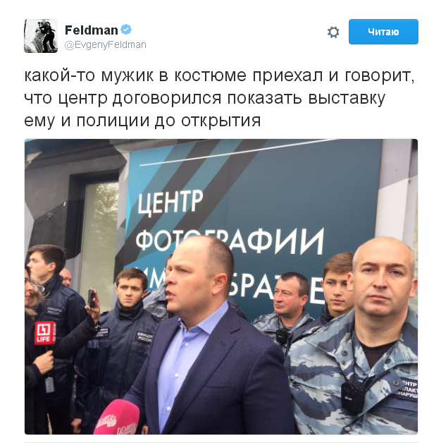 Кроме того, к зданию подъехал какой-то мужчина в костюме, который заявляет, что организаторы согласились ему и полиции показать выставку до открытия.
