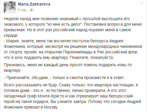 Однако Захарова рассказала подробности, при которых она узнала о том, что белорусу подарят квартиру. По ее словам, ее знакомый свел дипломата с благотворителем, имя которого не называется. Он и выразил желание сделать подарок Андрею Фомочкину.