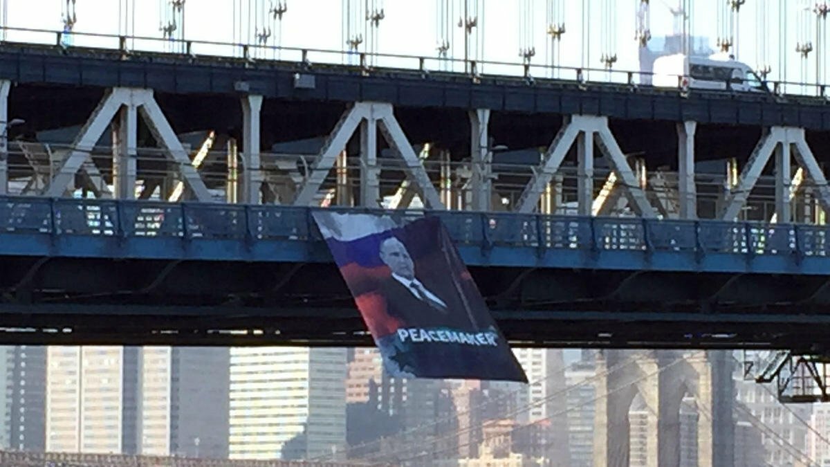 На плакате изображен Владимир Путин на фоне флагов России и Сирии. Внизу плаката размещена надпись – "миротворец". Баннер размещен на перилах Манхэттенского моста в Нью-Йорке, который соединяет два района города - Манхэттен и Бруклин.