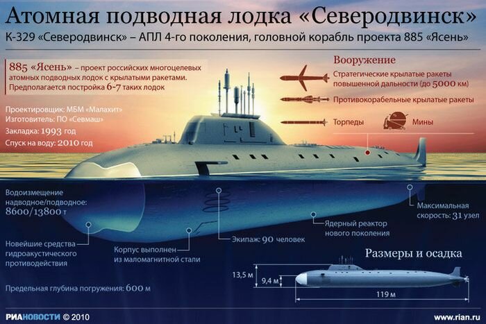 Лодка проекта "Ясень" имеет в длину 120 метров, а ее водоизмещение составляет 13 800 тонн. Экипаж субмарины составляет всего 90 человек, гораздо меньше, чем у американских аналогов, что говорит о высокой степени автоматизации. Внешне она напоминает субмарины более раннего проекта "Акула", но боевая рубка у нее гораздо ближе к носу. А еще у этой лодки есть горб, где размещаются установки вертикального пуска. Как пишет авторитетное издание Combat Fleets of the World, "Северодвинск" оснащен ядерным реактором ОК-650КПМ на 200 мегаватт. Он обеспечивает лодке скорость до 16 узлов в надводном положении и 31 узел в подводном, и имеет длительный срок службы. Согласно другим источникам, скорость у субмарины немного больше, составляя 35 узлов, и она может бесшумно идти под водой на скорости 20 узлов.