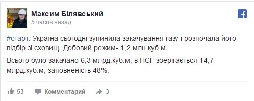 "Украина сегодня прекратила закачку газа и начала его отбор из подземных хранилищ. Суточный режим - 1,2 млн куб. м. Было закачано 6,3 млрд куб. м, в ПХГ хранится 14,7 млрд куб м, заполненность - 48%", - написал он на своей странице в Facebook.