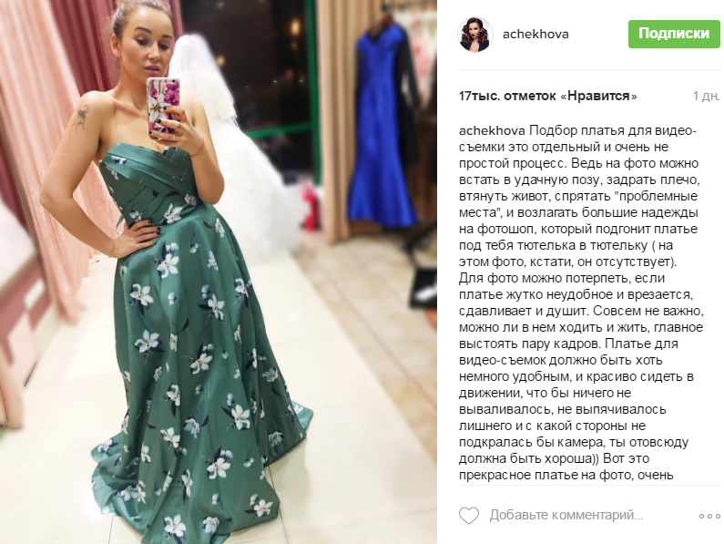 В этот раз звезда выложила снимок, на котором она запечатлена в платье. Заметно, что Анфиса сильно похудела. В комментарии под фото она рассказала, что бывает довольно трудно выбрать идеальное платье для съемок.