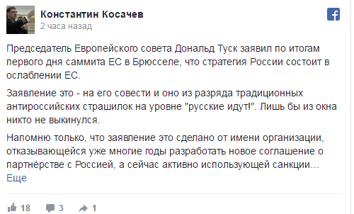 "Туск заявил по итогам первого дня саммита ЕС в Брюсселе, что стратегия России состоит в ослаблении ЕС. Заявление это — на его совести и оно из разряда традиционных антироссийских страшилок на уровне "русские идут!"". Лишь бы из окна никто не выкинулся", — написал он в своем Facebook.