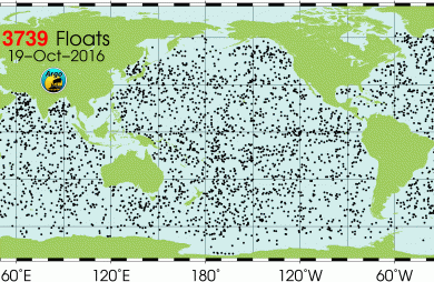 Принцип работы измерителя процессов в океанах заключается в наличии дрейфующего буя, который сплывает на поверхность, не забыв измерить температуру и соленость вод. Метод вариационной интерполяции минимизирует отклонение рассчитанных в узлах регулярной сетки полей температуры и солености от нерегулярно расположенных измерений.