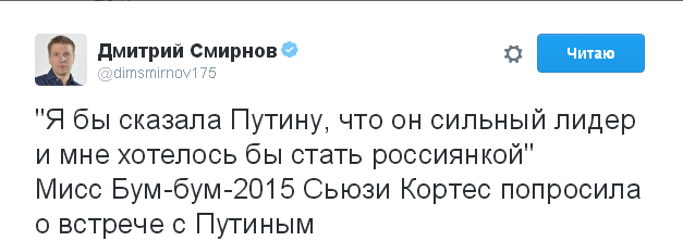 "Я бы сказала Путину, что он сильный лидер и мне хотелось бы стать россиянкой" Мисс Бум-бум-2015 Сьюзи Кортес попросила о встрече с Путиным", - написал в "Твиттере" журналист кремлевского пула Дмитрий Смирнов.