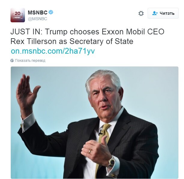 Американские СМИ еще накануне сообщили, что Трамп может остановиться на кандидатуре Тиллерсона, хотя до этого главными фаворитами считались республиканцы Рудольф Джулиани и Митт Ромни. Из штаба Трампа официального подтверждения о назначении Тиллерсона еще не последовало, хотя известно, что новоизбранный американский лидер встречался с Тиллерсоном в начале недели.