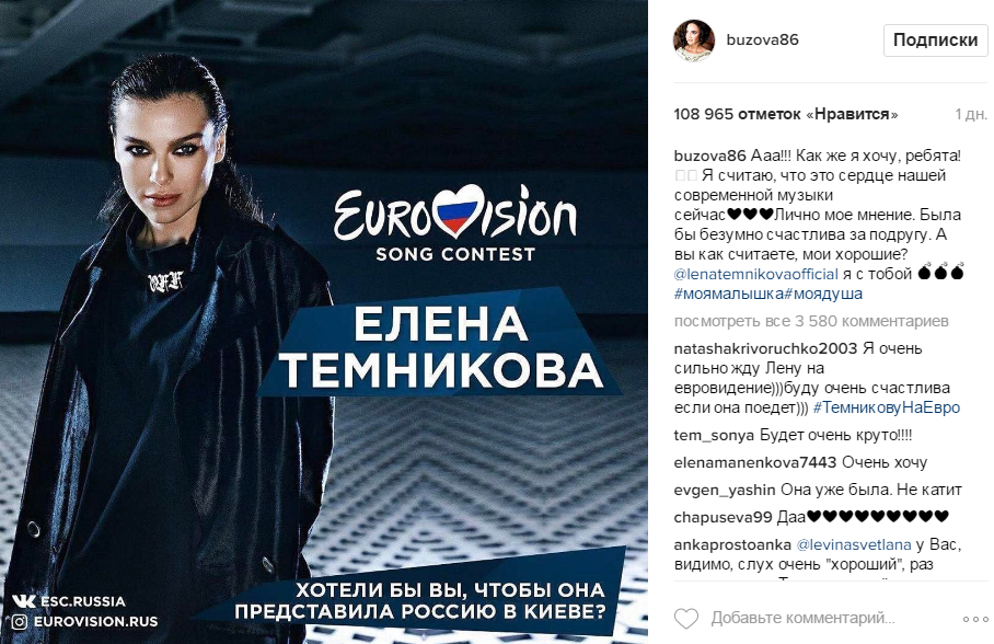 Сегодня Ольга Бузова опубликовала на своей странице в Instagram новое фото Елены, с которой тесно дружит несколько лет. На снимке певица позировала на фоне логотипа "Евровидение". Также на фото была надпись: "А вы хотели бы, чтобы она представила Россию в Киеве?"