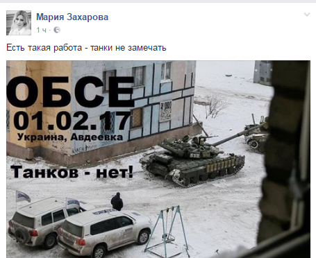 "Есть такая работа - танки не замечать", - написала Захарова на своей странице в Facebook, комментируя опубликованное российским журналистом Александром Коцем фото.