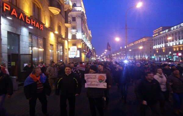 Пройдясь маршем по центру Минска, колонна протестующих прибыла к зданию Министерства по налогам и сборам. Активисты выражают свое недовольство введенного белорусскими властям налога на безработицу, требуя его отмены. Собравшиеся у здания ведомства протестующие также выкрикивали антипрезидентские лозунги, требуя сложения полномочий от президента Александра Лукашенко, называя его "усатым дармоедом".