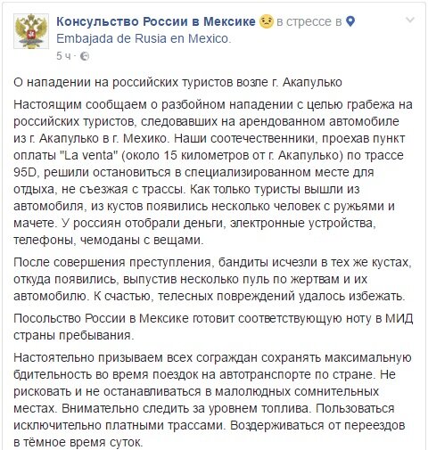 Как сообщает "Российский Диалог", об инциденте на своей странице в Facebook сообщило консульство РФ в Мексике. Отмечается, что российские туристы, арендовав автомобиль, направлялись из Акапулько в Мехико. После пересечения пункта оплаты, расположенного в 15 километрах от Акапулько, россияне решили остановиться в специализированном месте для отдыха, не съезжая с трассы.