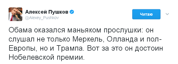 Член Совета Федерации Алексей Пушков, комментируя это заявление президента США, назвал Барака Обаму "маньяком прослушки"."