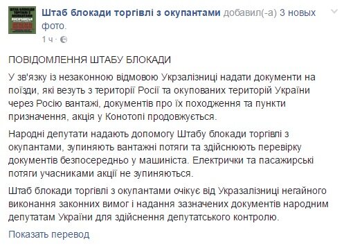 "В связи с незаконным отказом "Укрзализныци" предоставить документы на поезда, которые везут с территории России и оккупированных территорий Украины через Россию грузы, документов об их происхождении и пункты назначения, акция в Конотопе продолжается", - говорится в заявлении штаба.