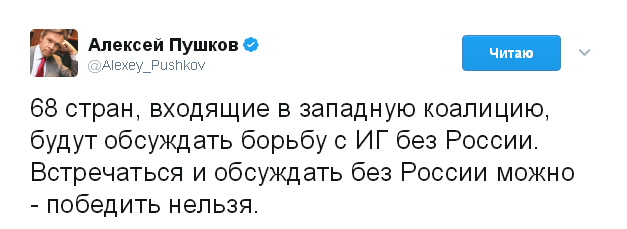 "68 стран, входящие в западную коалицию, будут обсуждать борьбу с "ИГ" без России. Встречаться и обсуждать без России можно - победить нельзя", - написал Пушков в "Твиттере".