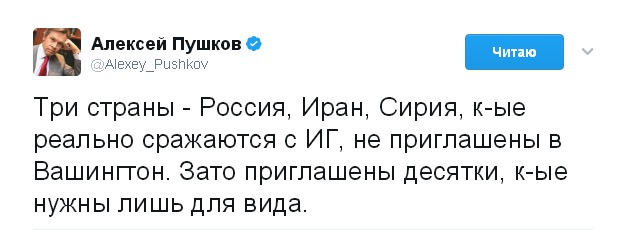 Сенатор отметил, что три страны - Россия, Иран и Сирия - которые реально сражаются с боевиками, на переговоры не приглашены, зато во встрече примут участие десятки других государств, роль которых в операции против террористов сводится к минимуму.