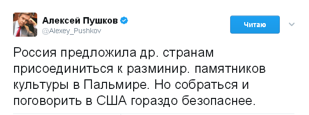 "Россия предложила др. странам присоединиться к разминир. памятников культуры в Пальмире. Но собраться и поговорить в США гораздо безопаснее", - подчеркнул политик.