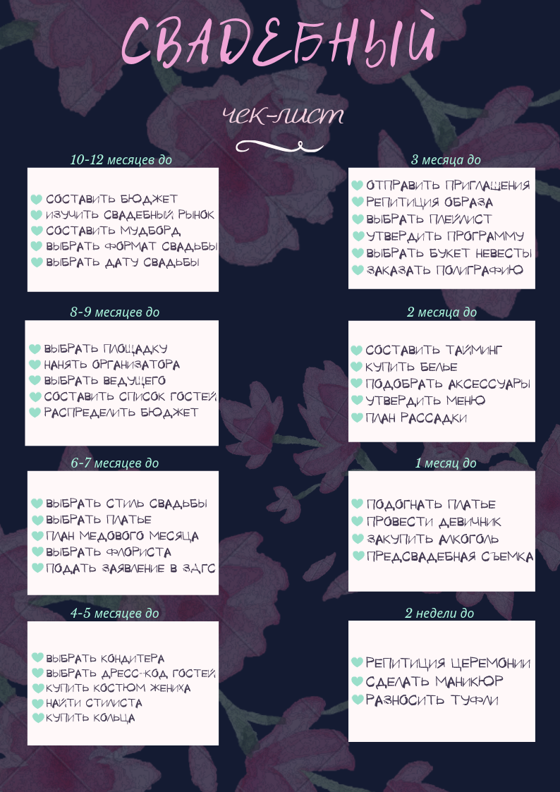 Подготовка к самому романтическому мероприятию в жизни влюбленных сопряжена со множеством сложных задач, поэтому часто молодожены предпочитают переложить часть нагрузки на свадебных организаторов. Однако, если организовывать торжество приходится своими силами, перечень важнейших пунктов выглядит устрашающе: