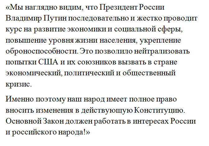 Пресс-секретарь Кремля Дмитрий Песков, комментируя данную инициативу, заявил, что вопрос о внесении изменений в основной закон страны, позволяющих занимать президентский пост три срока подряд, не стоит на повестке.