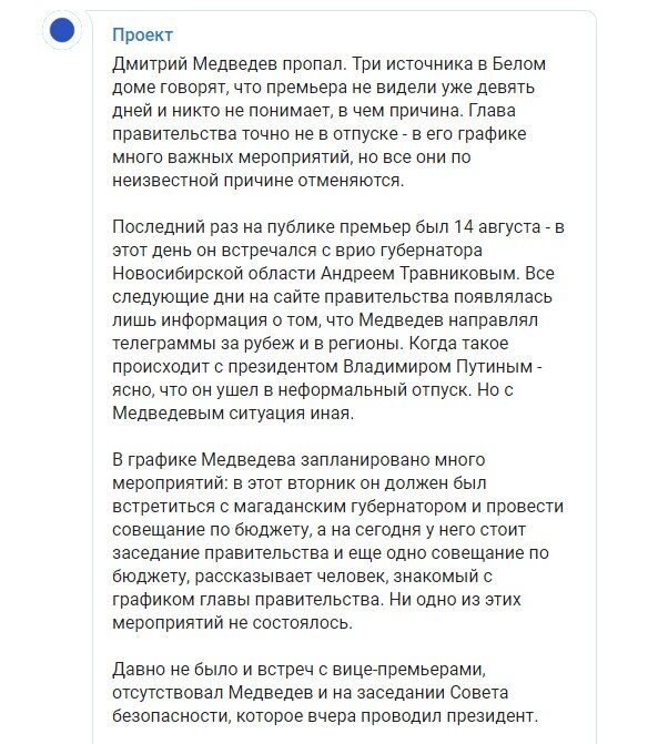 Известно, что 23 августа были отменены заседание правительства и совещание по бюджету, а 22 августа премьер не присутствовал на заседании Совета Безопасности.