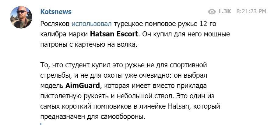 Военный корреспондент Александр Коц в своем телеграм-канале рассказал об оружии, из которого Владислав Росляков вел огонь в политехническом колледже в Керчи, передает "Российский Диалог".