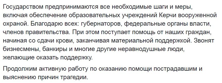 Пострадавшим оказывается вся необходимая помощь. В Керчь прилетела группа медиков во главе с министром здравоохранения Вероникой Скворцовой.