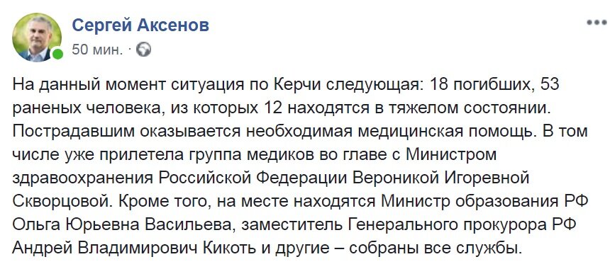 Глава Крыма Сергей Аксенов уточнил данные о погибших и пострадавших в результате нападения на керченский политехнический колледж. На своей страннице в Facebook он написал, что на данный момент картина следующая: 18 погибших, 53 раненых, из которых 12 находятся в тяжелом состоянии, передает "Российский Диалог".