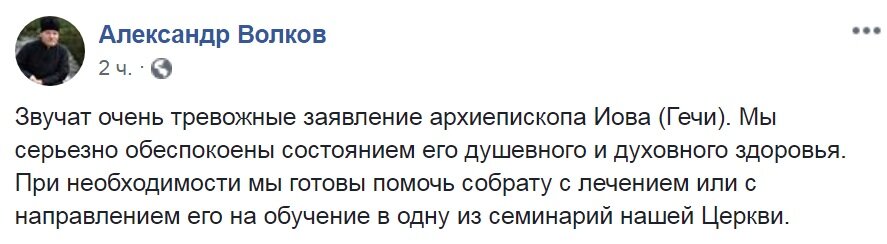 В Московском патриархате предложили помочь с "лечением" или обучением представителя Константинополя архиепископа Иове (Геча), который ранее пригрозил лишить Русскую православную церковь автокефалии. Пресс-секретарь патриарха Московского и всея Руси Кирилла священник Александр Волков написал на своей страннице в Facebook, что в РПЦ серьезно обеспокоены душевным состоянием и душевным здоровьем представителя Константинопольского патриархата, передает "Российский Диалог".