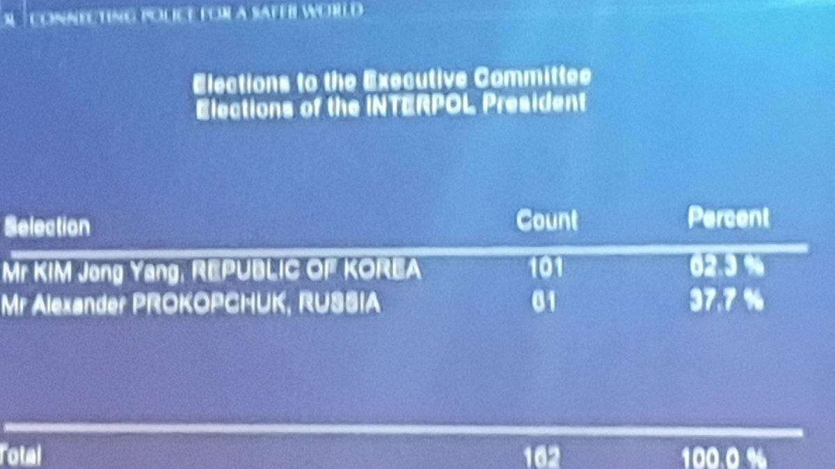 По данным министра МВД Украины Арсена Авакова, выборы главы Интерпола проходили в три тура. Согласно итогам последнего этапа, Ким Чон Ян набрал 62,3% голосов, а россиянин Александр Прокопчук – 37,7%.