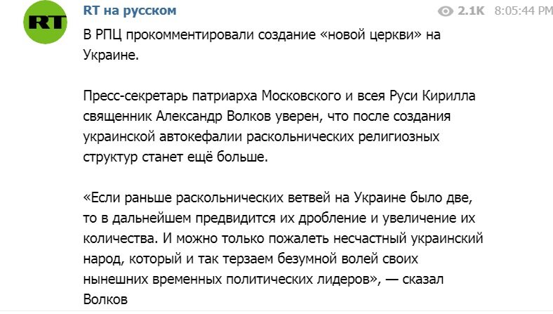 После создания украинской автокефальной церкви раскольнических религиозных структур на Украине станет еще больше. Такую точку зрения высказал пресс-секретарь патриарха Московского и всея Руси Кирилла священник Александр Волков, комментируя итоги так называемого "объединительного собора", передает "Российский Диалог".