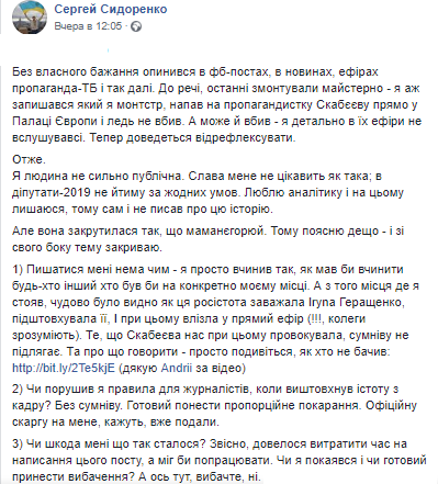 Как ни странно, редактор "Европейской правды" Сергей Сидоренко, который и начал рукоприкладство, не сделал должных выводов и не собирается извиняться перед ведущей телеканала "Россия 1". Украинец считает, что поступил также, как и любой нам его месте, передает "Российский Диалог" со ссылкой на страницу Сидоренко в Facebook. Хотя, несмотря на это, он признал "нарушение правил" со своей стороны.