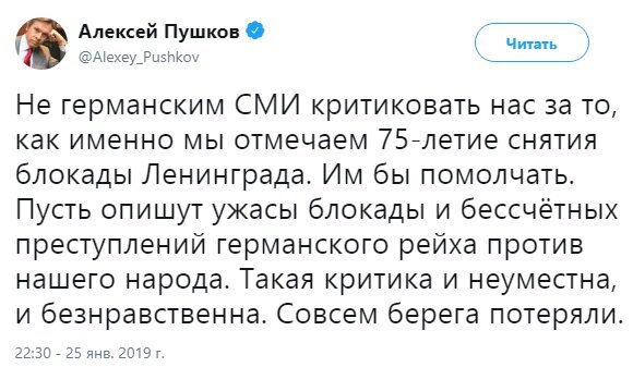 "Не германским СМИ критиковать нас за то, как именно мы отмечаем 75-летие снятия блокады Ленинграда. Им бы помолчать. Пусть опишут ужасы блокады и бессчетных преступлений германского рейха против нашего народа. Такая критика и неуместна, и безнравственна", – заявил он.