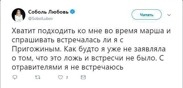 Юрист ФБК публично заявила, что у неё не было встречи с бизнесменом Евгением Пригожиным только 24 февраля. На своей странице в «Твиттере» Соболь опубликовала пост, согласно которому во время марша памяти Немцова журналисты одолели её вопросами относительно того, встречалась ли она с петербургским предпринимателем, и добавила: якобы раньше она уже опровергала «ложь» о переговорах. Telegram-канал «Выпускайте Кракена» заметил, что сотрудница Фонда Навального удалила данную запись спустя несколько минут после публикации.