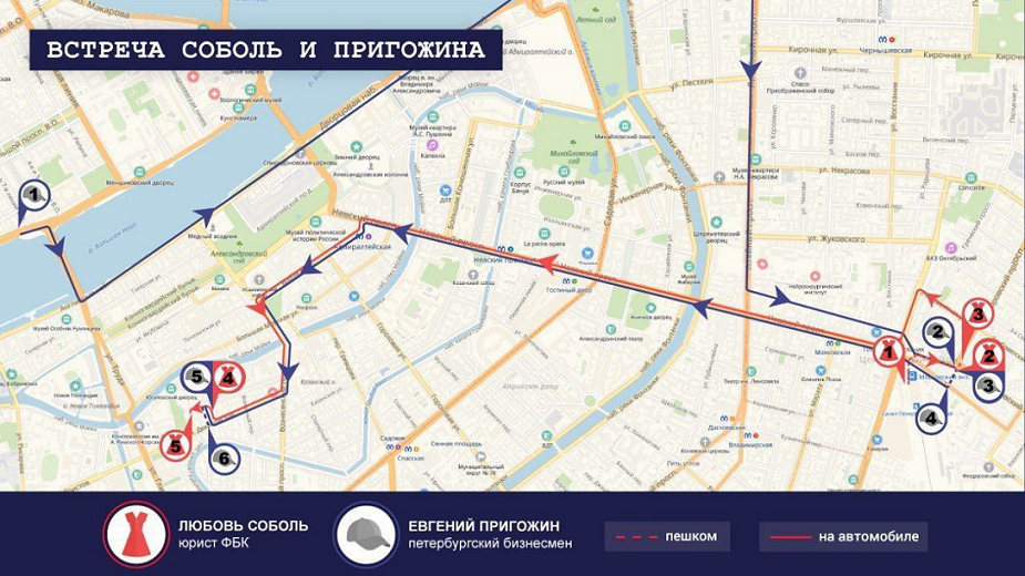 Позже некоторые Telegram-каналы разведали новые данные о встрече Любови Соболь и Евгения Пригожина: в информпространстве появился маршрут передвижений и юриста, и основателя ФБК в дни их встречи с петербургским предпринимателем. Согласно известной информации, обнародовал карту некто, представившийся «добрым стрингером».