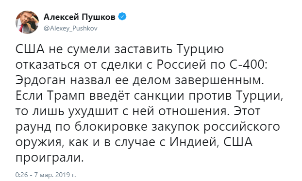 "Этот раунд по блокировке закупок российского оружия, как и в случае с Индией, США проиграли", - подвел черту сенатор.
