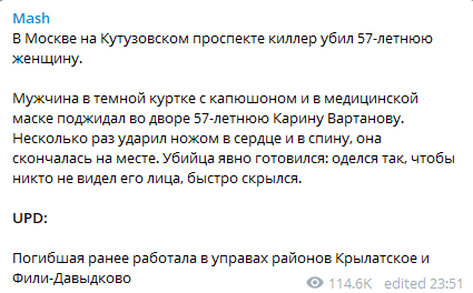 В Москве неспокойно: на Кутузовском проспекте произошло жуткое убийство. Как передает "Российский Диалог" со ссылкой на Mash, 2 апреля была зарезана 57-летняя Карина Вартанова. СМИ утверждают, что расправа была не ограблением или спонтанным нападением: смертельный удар женщине со спины нанес киллер. Утверждается, что она была главой благотворительного фонда "Детский паллиатив".