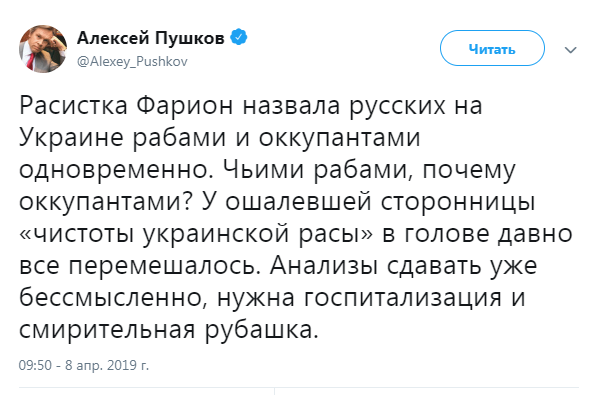 У себя в "Твиттере" Пушков справедливо заметил, что после этих слова Фарион можно смело называть расисткой.